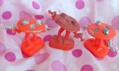 2 Eyed Moon Man, 3 Eyed Moon Man, Nebula M31 and the Purple People Eater (which also dates the set). In the 1990's a man by the name of Julius Lopes recast the aliens in a resinsolid form and painted them in brighter colors. The new rubber silicon molds cost him $10,000